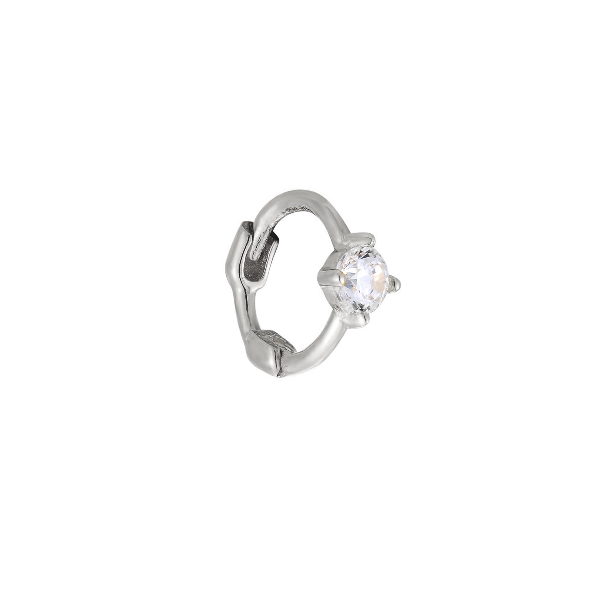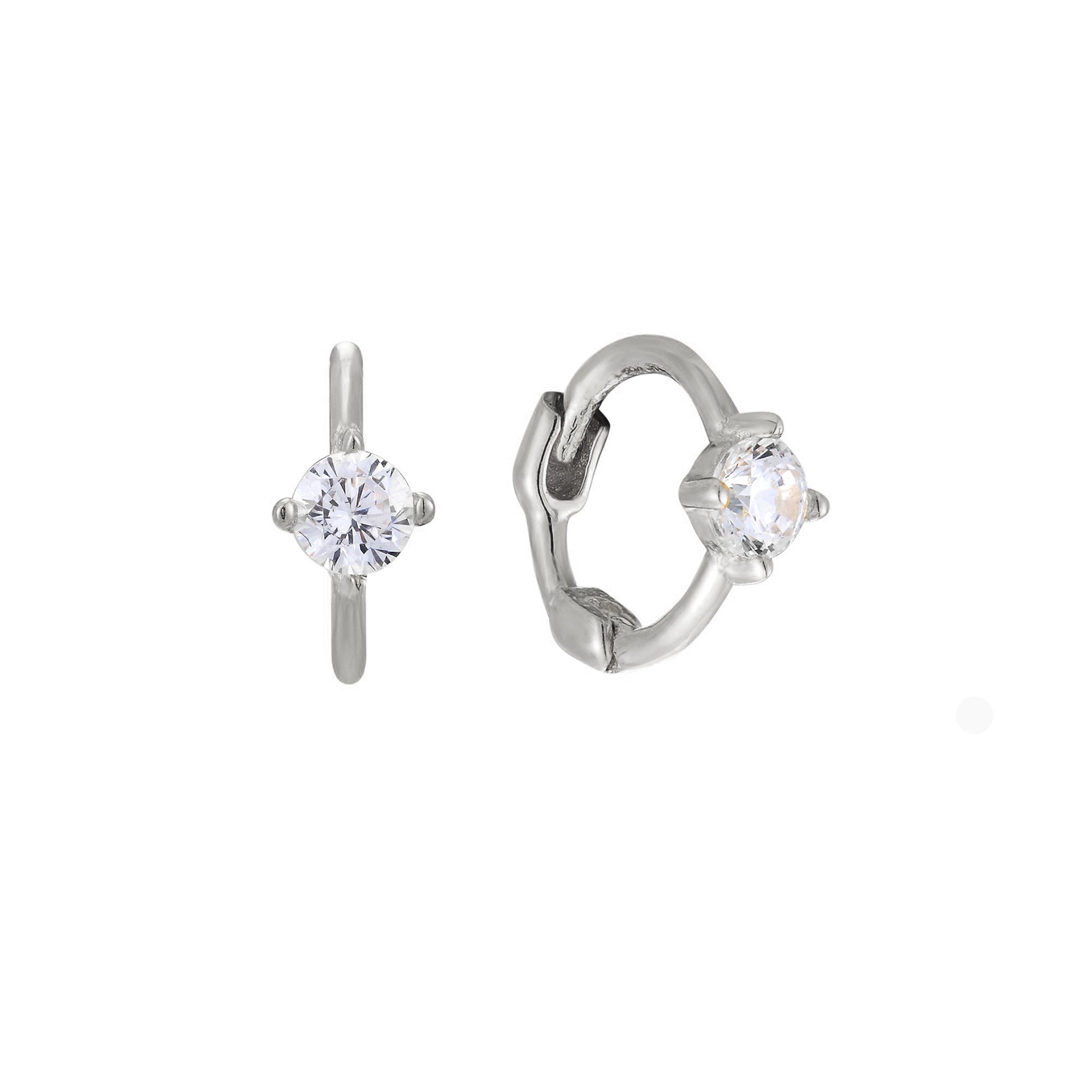 A pair of small 9ct solid white gold hoop earrings with cubic zirconia stones, displayed against a white background - seolgold