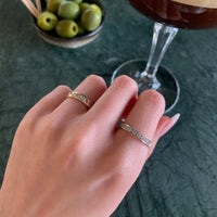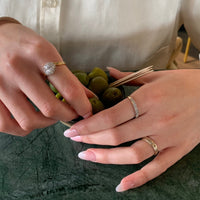 Silver ring with diamonds on a white hexagonal stand, featuring 'S + G Vintage' branding - seolgold