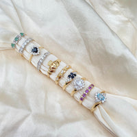 Gold ring with a blue gemstone and diamond accents on a white hexagonal stand, branded 'S + G Vintage' - seolgold
