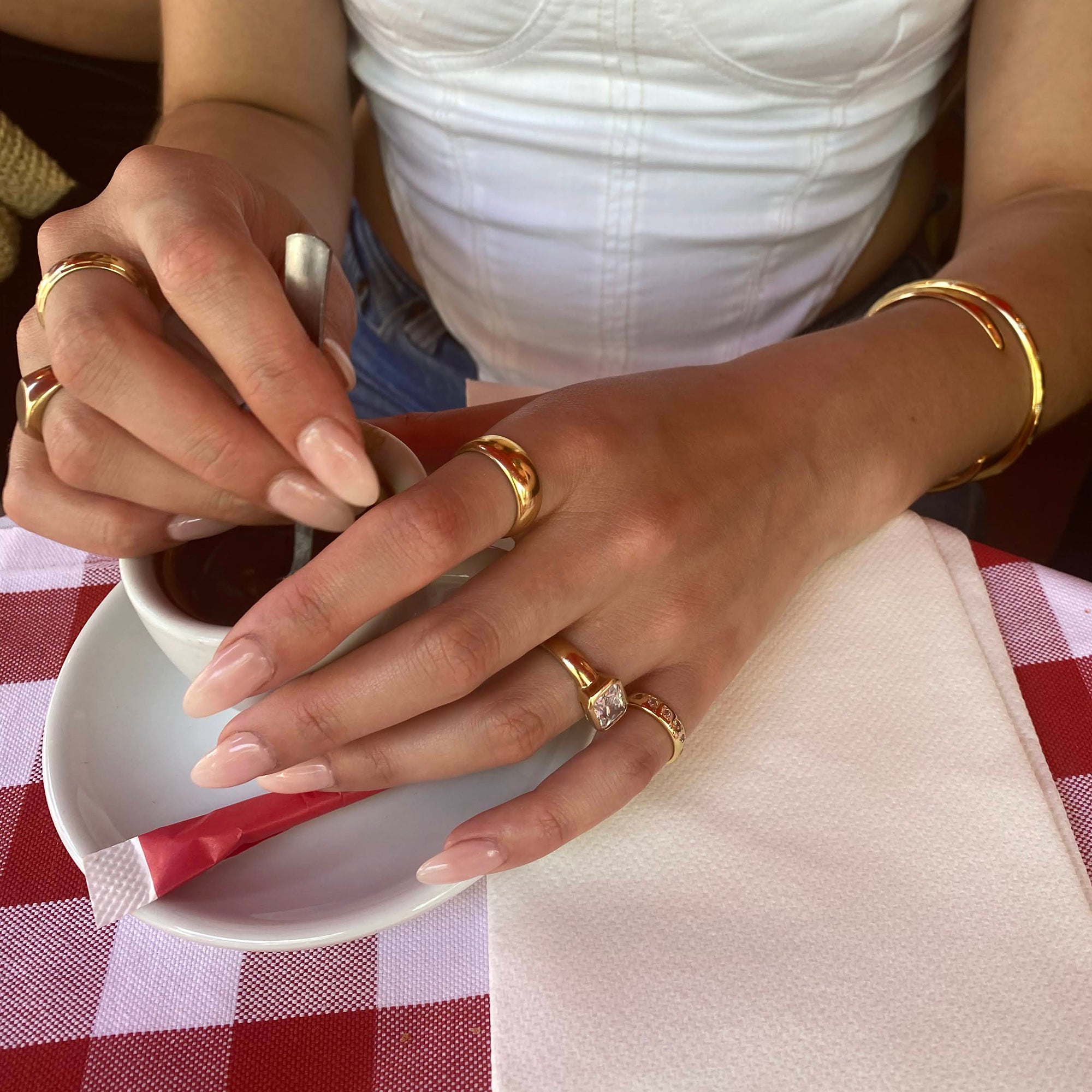 To give your jewellery a quick freshen up we suggest cleaning with a soft, lint-free cloth or, for extra sparkle power, a gold polishing cloth. But be gentle, avoid rubbing, as this will bring the gold plate off your piece.