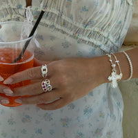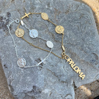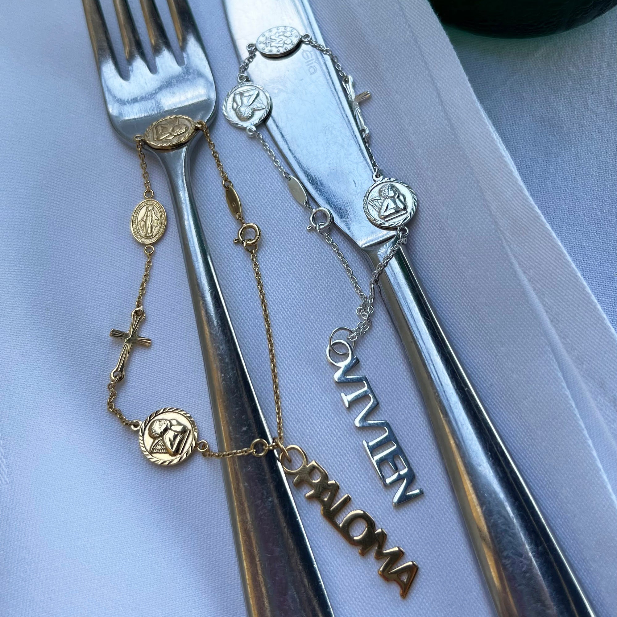 A delicate Virgin Mary, cross and cherub bracelet, capturing a romantic vintage appeal to layer with more bracelets or wear solo.