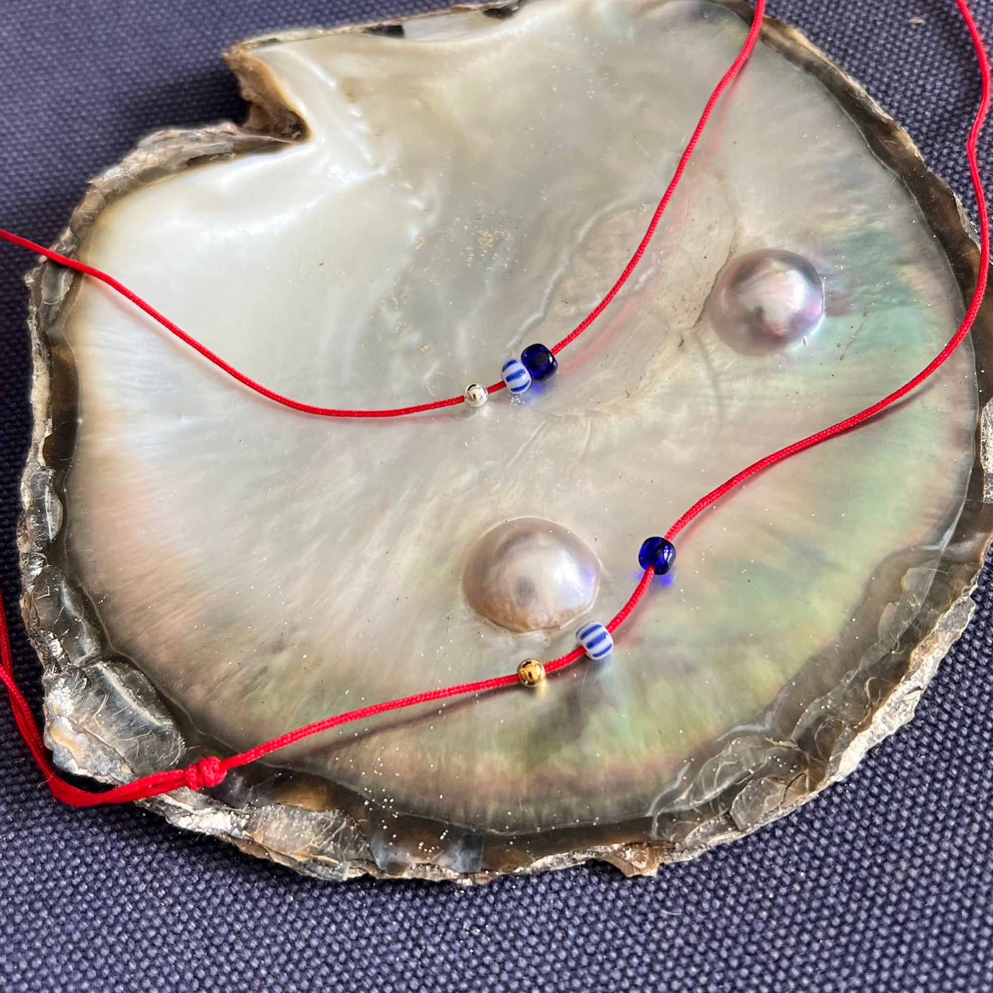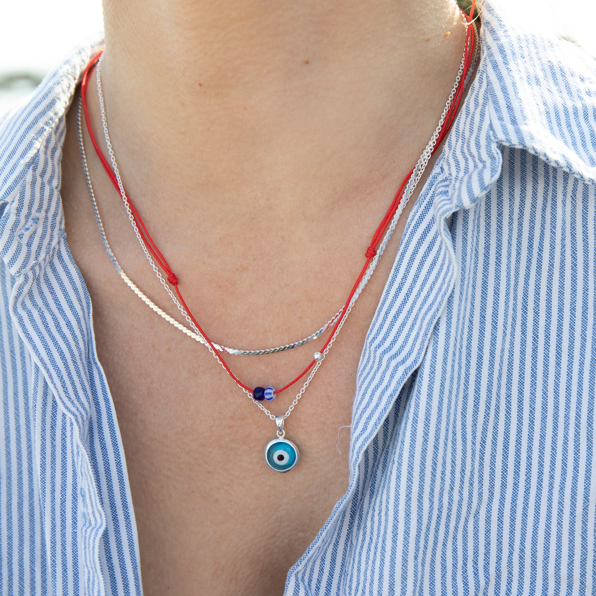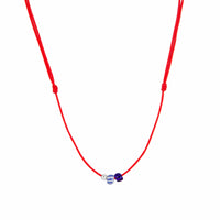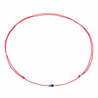 Red cord necklace with glass blue and silver beads.